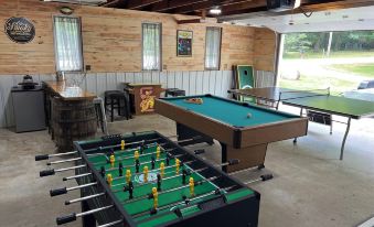 In addition to all there is to enjoy indoors, we offer endless fun outside including a private pier, 2 kayaks, 1 child kayak, paddle board, paddle boat & life vests for all to use during your stay. Also available to you are fishing poles, sand toys and some lake toys. Or bring your own boat! Down by the lake, there is a beautiful firepit right on the water - FREE firewood! The garage is another perk, offering lots of fun with a bar, arcade games, foosball, air hockey, dart board, bags set and other fun outdoor games.