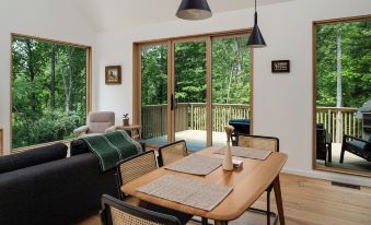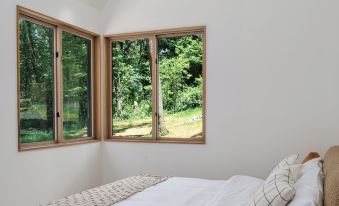 Escape to our serene one-bedroom retreat, perfectly perched to offer panoramic views of the surrounding forest and Weaverville’s quaint village. Designed with an emphasis on sustainability and feng shui principles, this architect created haven features large windows and a private deck 12 feet off the ground, immersing you in nature while providing all the comforts of modern living.