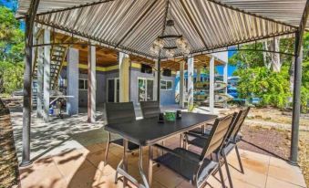 This awesome property offers tons of outdoor seating & water toys for your relaxation & pleasure.