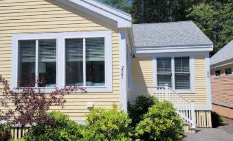 Cottage #225 is a duplex unit. The entrance of cottage 225 leads you into the beautifully decorated porch lounge area furnished with a plush sectional, ottomans, side tables, lamps, ceiling fan, and flat screen TV. Through the sliding doors you will enter into the open concept living/dining room area. The kitchen is fully equipped with stainless steel appliances, including a dishwasher, and a counter-top flat screen TV. The dining area provides seating for 4 and the living room area provides a cozy chaise sectional. Just past the kitchen is the bathroom and a closet where the stackable washer/dryer is housed. The bathroom is full size with a stand up shower and will be fully furnished for your use! Beyond that is the rear exit where the outdoor entertaining area is equipped with outdoor umbrella, table, and grill ! You will definitely feel like you're in the Maine woods in this nice, private, wooded backyard! In both bedrooms, enjoy the plush queen size bed beneath the soothing breeze of the ceiling fan. Each bedroom also has a wall mounted flat screen tv, as shown in the pictures! 4 ppl MAX -- This cottage accommodates parties of 4 people maximum * Amenities are not open during winter season ***No smoking, No Pets! ***Pools and Hot tub will be available as of memorial weekend. Clubhouse amenities including gym, library, games (courts), shuffleboard, and Sandbar will be available starting May 1st (Sandbar is weekends only). Sandbar schedule is subject to change. Ask the front desk for the current schedule when booking. *During peak season (June 18th - August 20th) cottage rentals require a 7-night rental, from Saturday to Saturday. Anytime outside of peak season, there is only a 2-night minimum to book. Disclaimer: Please note that all 3 season cottages and 4 season cottages have a sunroom that is not heated. During the colder months of September-May, it may be chilly in the sunroom/t.v. room, we want to advise you of this as we do not provide extra heating. All 4 season cottages will only be 4-person in the winter months.