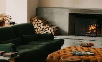 From our large windows and spacious balconies the view of Alpine peaks captivates. Inside every detail is inspired by the mountains. Noble locally sourced materials blend seamlessly with contemporary lines extending the connection with nature. Spruce parquet floors natural lime walls green granite bathrooms and thick oollen textiles pay homage to local craftsmanship and the raw beauty of the Alps creating spaces that are both warm and refined with a calming atmosphere.