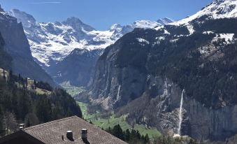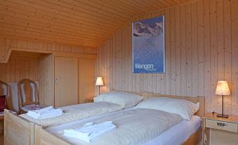 Chalet "Plein Soleil". Below Wengen 600 m from the centre of Wengen, in a quiet, sunny position on a slope. In the house: central heating system. Pre-arrival grocery service. Shop, supermarket 600 m, restaurant 300 m, bakery 600 m, 7 minute walk to the centre, bus stop "Lauterbrunnen (by train)" 3.6 km, railway station "Wengen" 600 m. Cable car, skisport facilities 600 m. Well-known lakes can easily be reached: Thunersee 13 km, Brienzersee 13 km. Please note: car-free holiday complex. Arrival via mountain railway. "Plein Soleil", 3-room apartment on the top floor. Cosy and wooden furniture furnishings: living/dining room with cable TV. Exit to the balcony. 1 room with 2 beds (90 cm, length 200 cm). 1 small room with 1 x 2 bunk beds (90 cm, length 200 cm). Kitchen (oven, dishwasher, 4 ceramic glass hob hotplates, toaster, kettle, electric coffee machine, Capsules for coffee machine (Nespresso) extra, fondue Set (cheese)). Bath/WC. Balcony, west facing position. Balcony furniture. Marvellous panoramic view of the mountains and the valley. Facilities: iron, hair dryer. Internet (WiFi, free). Please note: suitable for families. Non-smokers only.