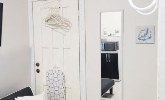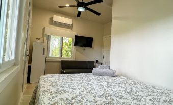 Cozy suite with a full-size bed and a sofa bed, ideal for couples or small families. Includes A/C, microwave, coffee maker, and access to the shared BBQ area, kitchen, and small pool.