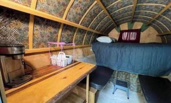 Queen bed with luxurious bedding, bench seating, shelving and storage. Deck overlooking the Cumberland River. The drive to the setup is a one lane gravel drive to the riverbank, can be bumpy.