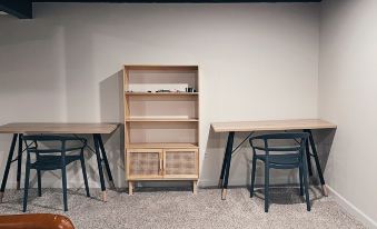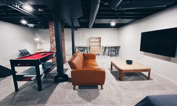 The lower-level (basement) living space features a TV with leather couch, one queen-sized bed, and laundry room. We recently added new mini gaming set with Pool Billiards, Air Hockey, Foosball and Table Tennis! We also added working desk and more sitting area in the basement!