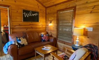 Our cedar two bedroom, two bath modern secluded cabin with central heat & air and all of the needed modern conveniences will be waiting for you with a highly rated bottle of red wine. There are two bedrooms, each with queen sized beds. In the living room is a pull out couch that can sleep two. There is also a fold up cot that will sleep 1 adult. On the large front screened in porch, there is an additional fold out bed that can sleep one as well. The front porch overlooks trees, the fire pit, and includes rockers, cushioned chairs and games. Located in the living room is an electric fireplace often used by guests in the winter months.