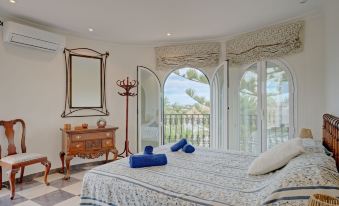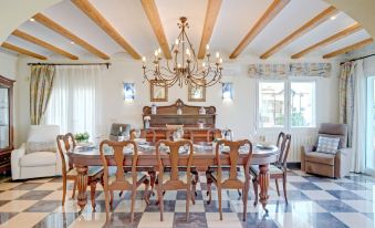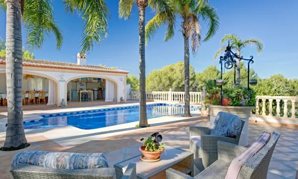 Very large, very beautiful, very comfortable villa "Carpe Diem", 3 storeys. In the district of Pinosol, in the resort 2.8 km from the centre of Arenal Javea, in a quiet, sunny position, 2.8 km from the sea, 2.8 km from the beach. Private: beautiful, well-kept garden (fenced), orchard (fenced), swimming pool (14 x 5 m, depth 40 - 210 cm, seasonal availability: 01.Jan. - 31.Dec.) with internal staircase. Shower/WC in the pool area, pool house with fridge and cooking stove, pergola, garden furniture, barbecue house, parking (for 4 cars) on the premises. Supermarket 2.3 km, restaurant 500 m, café 550 m, bus stop "Parada antiguo Mas y Mas" 2 km, sandy beach "El Arenal" 2.8 km, rocky beach "Segundo Muntanya" 3 km. Sports harbour 2.8 km, surf school 2.8 km, sailing school 2.8 km, tennis 3 km. The owner does not accept any youth groups. "Villa Carpe Diem", 5-room villa 250 m2 on 3 levels. Spacious and bright, very comfortable and stylish furnishings: living/dining room with satellite TV, air conditioning and forced-air heating. Exit to the patio, to the swimming pool. 1 room with 2 beds (90 cm, length 200 cm), shower/WC and fan. 1 room with 2 beds (90 cm, length 200 cm), fan. Open kitchen (oven, dishwasher, 4 ceramic glass hob hotplates, toaster, microwave, freezer, electric coffee machine). Shower/WC. On the lower ground floor: 1 room with 1 french bed (135 cm, length 200 cm), fan. Shower/WC. Upper floor: 1 room with 1 double bed (2 x 90 cm, length 200 cm), shower/bidet/WC, double hand-basin, satellite TV, air conditioning and forced-air heating. Exit to the balcony, to the terrace. Large terrace 200 m2. Terrace furniture, barbecue, deck chairs, covered balcony, sitting area. Very beautiful view of the sea, the mountains and the valley. Facilities: washing machine, dryer, iron, children's high chair, baby cot, hair dryer. Internet (WiFi, free). Parking. Maximum 1 pet/ dog allowed. VT-511313-A ESFCTU00000307100021696500000000000000000VT-511313-A5