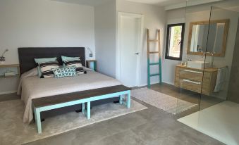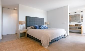 Also on the ground floor is the master bedroom, which is equipped with a king size bed (box spring, 1.80m) and a private bathroom (with walk-in shower overlooking the sea). The toilet is in the bathroom, but spatially separated with a door. The highlight is the very spacious, walk-in closet. Floor-to-ceiling windows allow unobstructed views of the sea. Also from the master bedroom you have access to the garden and pool via a sliding door.