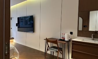房間裝修温馨,配的桌椅那些都很有質感,還有穿衣鏡。窗簾是電動的,遮光效果很好,玻璃也很隔音。床品舒服,床墊也巴適,老闆是用了心裝修的。最主要是房間的電視特別大,應該是75寸的,觀影效果超級好。