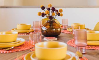 Continue to be amazed by the vistas while you cook in our fully-equipped kitchen. We have spacious countertops, double ovens, and appliances like a KitchenAid mixer, Café drip coffee maker, Smeg toaster, and more. You’ll find plenty of pots & pans, cooking utensils, baking trays, and serving dishes to make any meal possible. Enjoy your cuisine at our gorgeous, 6-person, oval indoor dining table, or while taking in the desert views, at our outdoor deck dining table.