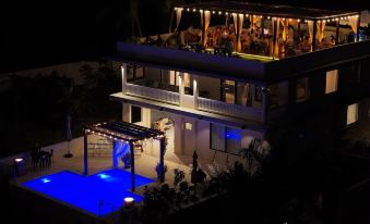Explore the outdoor offerings of Casa Bella with a range of amenities, including a 24’ infinity pool, a large covered patio with a pool-side bar and 5-burner grill perfect for an alfresco meal, as well as a rooftop lounge that doubles as an event space. Towards the front of the property is the charming residence of your gracious host, ever ready to assist you with anything you might need.