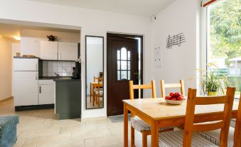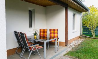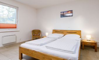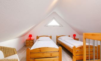 Single-family house "Ella". On the outskirts, 1 km from the centre of Zinnowitz, 1 km from the sea, 1 km from the beach. Parking on the premises. Supermarket 550 m, restaurant 500 m, bakery 1 km, café 1 km, bus stop 100 m, railway station 450 m, sandy beach 1.3 km, thermal baths "Bernsteintherme" 1.5 km. Marina 2.1 km, golf course (18 hole) 25 km, surf school 1.5 km, tennis 1.1 km, minigolf 1.3 km. 2-room apartment 69 m2 on 2 levels, on the ground floor. Cosy furnishings: living/dining room with Scandinavian wood stove and satellite TV (flat screen), radio. Exit to the terrace. 1 room with 1 double bed. Kitchenette (oven, 4 ceramic glass hob hotplates, toaster, kettle, electric coffee machine). Shower/WC. Electric heating. Top floor: open gallery with sloping ceilings with 2 beds. Terrace. Terrace furniture. Facilities: children's high chair, baby cot, logs (extra). Parking (1 car). Please note: non-smoking house. Smoke alarm. Instead of an enclosed bedroom, some sleeping areas are located in an open-plan area (gallery, alcove, etc.).