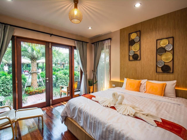 Thienhom Amphawa Resort is located by the riverside, surrounded by lush coconut trees. The rooms are luxuriously decorated, offering privacy and fully equipped amenities. The resort features various villa-style rooms, both small and large. Guests can enjoy activities such as boat rides to observe the local way of life in Amphawa and participate in morning almsgiving, combining travel with merit-making. Additionally, it is conveniently close to the floating market.