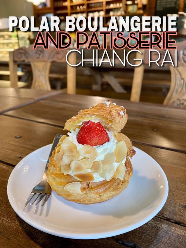 POLAR BOULANGERIE AND PATISSERIE This shop is another shop in Chiang Rai that is famous for its desserts and baked goods, some of the most delicious in Chiang Rai. Good drinks, excellent service. When I arrived, I tried the shop's signature menu, strawberry choux cream. The cream is smooth and fine, the choux dough is fragrant, and the strawberry topping is perfect. The drinks are good, the food is average, and the price is not high. The shop is made of wood, decorated well, and has a chill atmosphere. The other dessert menus are equally delicious. The shop is open from 8:30 a.m. to 4:30 p.m. #cafe #point out delicious restaurants #Northeastern team #cafe review #thailand #life addicted to cafes