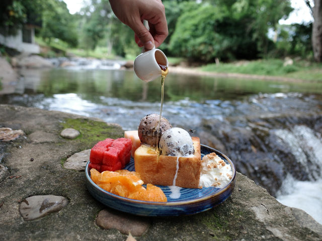 Pang Fan: Rock n' River is a place with many photogenic spots. The atmosphere is great, with waterfall views and a lawn, perfect for relaxing. They also serve food and drinks, including desserts. It's a relaxing place with a variety of savory and sweet dishes and drinks. For nature lovers, this is another place I highly recommend in Chiang Mai. #GetDiscountsWithoutLuck