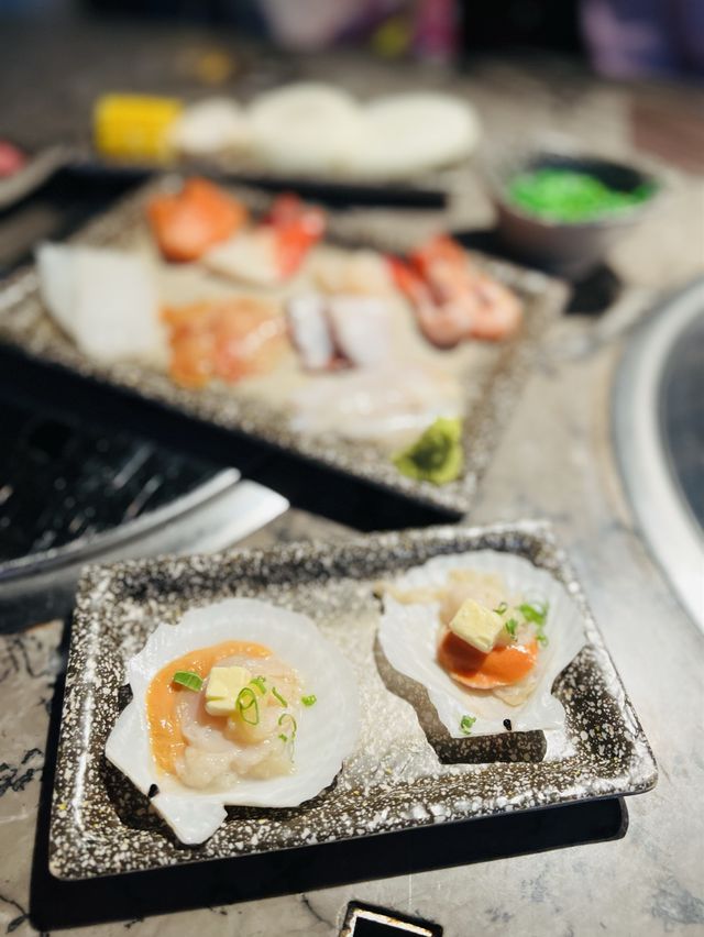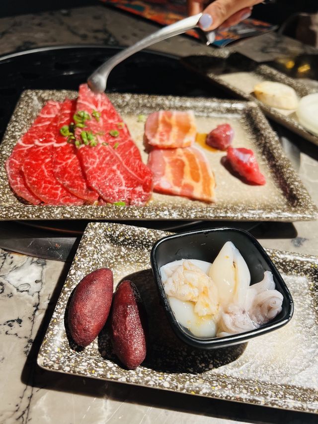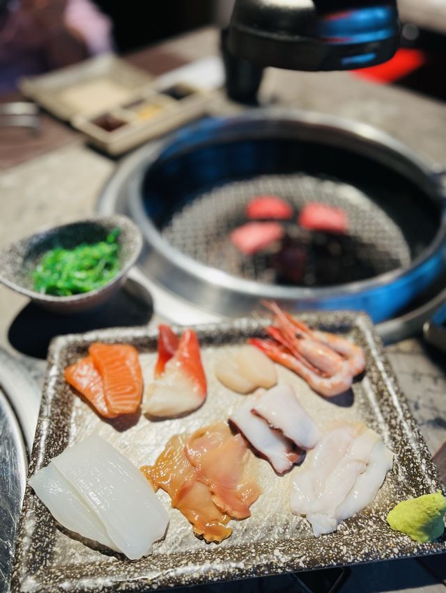 This barbecue is not easy to book a place, today finally ate with friends to eat an early dinner ~ 5:30 start eating, once seated have hot tea after ordering. We chose the $368 beef sea ji set, which features a variety of meats, sashimi, sushi, fried food and more. The wagyu beef is beautiful, 6 different wagyu beef parts, the meat is very beautiful: front breast, middle belly, breast, transverse septum, beef belly, upper small ribs. The wagyu beef is fragrant and juicy enough, and the parts are quite good. I think the top American beef plate, with onion thin grilled, beef flavor is very fragrant like the usual Japanese Teppanyaki flavor. The sashimi conveniently chose salmon, scallops, sweet shrimp, shiitake mussels, octopus, squid, mussels, red mussels, everything knows how to eat a little quite good. We also ordered squid, fried wagyu beef, octopus balls, etc., and we were full #summertrip #gourmetsummer #food #japanesefood #hkfoodie #foodie #hkrestaurant #alloucaneat #allyoucaneat #foodblog