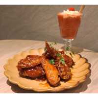 Whether it's lunch or afternoon tea, the restaurant is always packed. There's a large cherry tree at the entrance, and the tables next to it are filled with handicrafts—perfect for photo ops! Japanese Fried Chicken Wings—the wings are fried to a crispy, not-too-greasy texture, coated in a sweet soy sauce, and topped with sesame seeds. Absolutely delicious! Japanese Red Wine Braised Beef Omelette Rice—the beef is incredibly tender and rich in beef flavor. The moment the egg in the omelette is cut open, the runny egg oozes out, and the red wine drizzle immediately creates a truly comforting experience! Japanese Fried Pork Cutlet Rice with Nanban Tartar Sauce—the pork... The pork chop was crispy, and the batter adhered perfectly to the pork chop without falling apart. The middle layer was filled with cabbage, and the bottom layer was Japanese rice, which had a smoky, sweet texture. The Japanese Pudding Boat is essentially two layers: the top layer is egg pudding, which is not too sweet and has a strong egg flavor; the bottom layer is a cheesecake. The cheesecake and cheesecake are layered together, creating a rich, smooth cheese flavor. It's also topped with fresh, sweet fruit. It's super delicious. Red Bean Milk—Plenty of red beans, not too sweet, and a pleasant drink. Strawberry Smoothie—Tart and sweet, very appetizing. Address: Chicha Choubo (Causeway Bay) Shop 8, 4/F, World Trade Centre, 280 Gloucester Road, Causeway Bay Featured: Japanese Restaurant Price per person: $200 Rating: 🌟🌟🌟🌟🌟 #hkfood #SummerFoodRecommendations #foodie #hkfoodie #HongKongFood