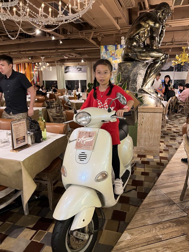 Address - Amaroni's New York Italian Restaurant & Café (New Century Plaza) (Mong Kok) Shop 526, 5/F, MOKO New Century Plaza, 193 Prince Edward Road West, Mong Kok Environment/Facilities - Very stylish restaurant, favorite motorcycle in the restaurant 🥰 Specialties - Lasagna, tiramisu Price per person - $200 Rating -8.5 Children for the motorcycle to go in to eat 😂 ordered a 2-person meal and additional salad and extra money to upgrade drinks 😋 classic lasagna super tasty (feel very authentic, long time not tried this taste 😋), pizza is ok, 2 cups of drinks portion is very large 😂 I can not drink 🙈 The best thing is the tiramisu 😋 big portion! Also arranged for us to sit at the counter, while eating while looking out the window view, very comfortable 🥰👍🏻 #hkfoodie #CenturyPlaza #ILoveItalian