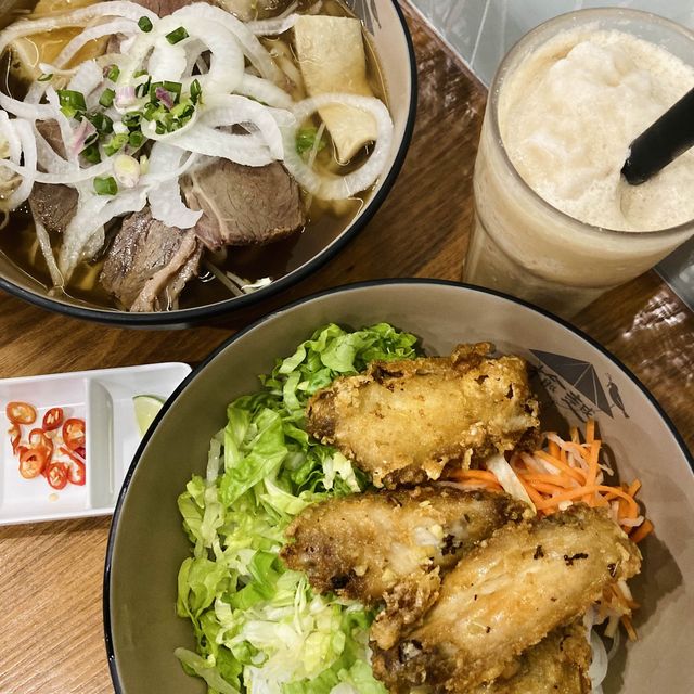 This Yu Yue shop located in Tin Shui Wai Tian Yi Mall, comfortable environment to eat some Vietnamese food in hot weather is best! For chicken wings lovers, I ordered the garlic butter chicken wings Vietnamese laksa. The soul of the laksa is Nuoc Cham, which is the sweet and sour fish sauce. Roast beef rice paper rolls This plate of rice paper rolls looks quite good 🤔, it is quite special with fried soft shell crab as the filling 😋 eat the entrance taste special, soft outside and crispy inside taste is very fragrant 😋, especially soft shell crab is very crispy taste full of very tasty 😙, order D juice even more delicious! Mix beef broth powder The mixed beef soup powder chose the golden belly and beef balls. The rich beef bone soup is homemade. As the rice noodles enter the taste buds, the taste is rich! Coconut smoothie coffee The coffee tastes rich, with the coconut taste quite matched, plus the ice cream, in such a hot time, the entrance with coconut flavor and rich coffee flavor, refreshing and thirst-quenching, very different flavor! #Yuyue #Yuyueviesta #Tianyimall #tinshuiwai #tinshuiwaifood #Vietnamese cuisine #wingslovers #hkig #hkkol #hkblogger #hkbloggerlife #hkfood #foodhk #hkfoodie #hkfoodies #hongkong #discoverhongkong #hongkong #hkfoodblogger #mainland customs clearance