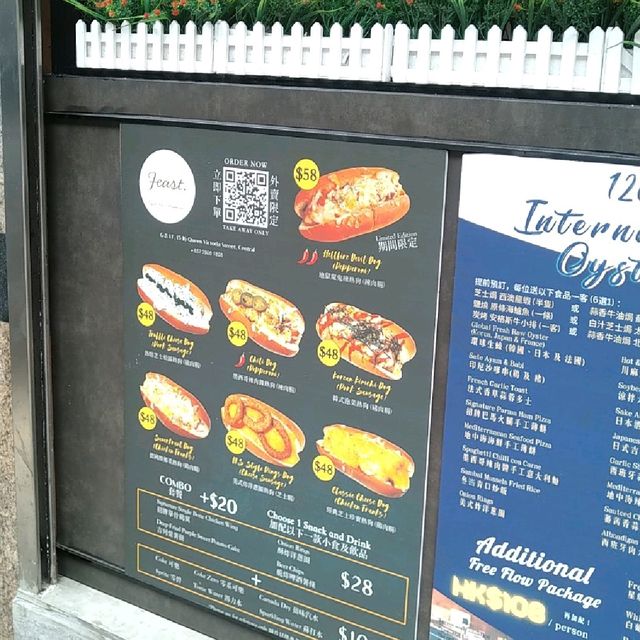 Feast Oyster Bar Address: G/F and 1st Floor, 15-16 Queen Victoria Street, Central G & 1/F, 15-16 Queen Victoria Street, Central HOTDOG is a foreign STALL/STREET FOOD, many FOOD trucks buy one, buy and eat. Holidays are particularly late to get up, and lazy to buy a TAKE AWAY home to eat slowly, while eating while playing games to watch NETFLIX combo set with snacks and drinks, 6 flavors HOTDOG, $48 for one, and can UPGRADE includes DRINK and SNAKC Classic Cheese Jumbo Hot Dog $68 SET Inside the chicken mushroom sausage plenty of hot melted cheese, the sausage is large and delicious, every bite is very tasty Hell Devil Spicy Hot Dog Hot Dog $68 Top with red chilli, challenge There are four pieces in total of single bone chicken wings, which is two chicken wings The single-bone chicken wings are fried to a crispy texture. The chicken wings are cut into two for easy meat spitting. Use paper boxes and bags for takeaway, grab them and take them home to enjoy #HongKongFood #hkfood #hkfoodie #yummy #foodporn #delicious #cuisine #restaurant # #restaurant #HOTDOG #FeastOysterBar