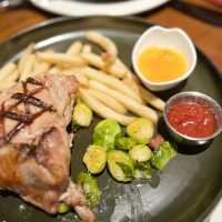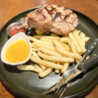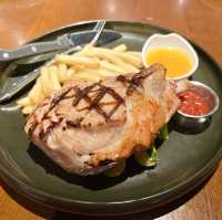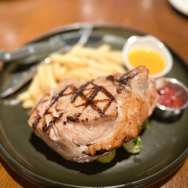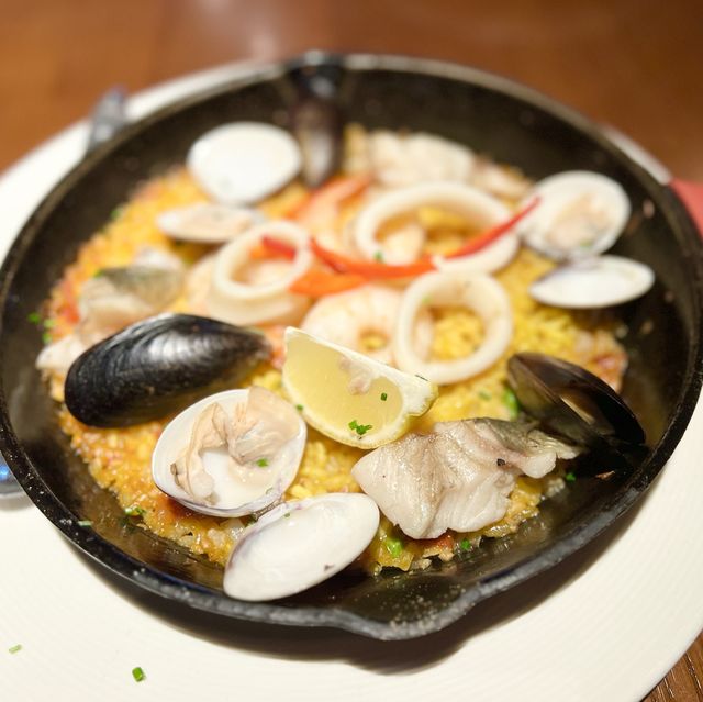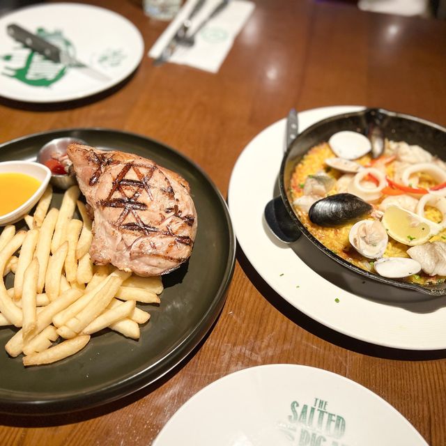 Every time I go to Metroplaza, I am attracted by the sign of the big pig in the atrium. I happened to go to Kwai Fong to buy snacks that day, so I decided to try it with my wife😁 ✏️Location (9/10): 5th floor of the atrium, the location is very convenient ✏️Environment (8/10): The decoration is quite modern and the seats are comfortable ✏️Service (7/10): The dishes are served quickly after the order is placed, and they will also actively provide plates for sharing ✏️Food (8/10): With pig as the theme, other Western food is also provided, and an open flame charcoal grill is used 🌟Grilled Axe Pork Chop - $260 The pork is super thick and big, the meat is tender and juicy, the meat is white, and it has the aroma of charcoal grilling, the peach juice is sweet, and it is very filling with bacon, cabbage and French fries😍 🌟Spanish Seafood Rice - $235 Although the rice is not much, there are a lot of seafood on the side dishes, including shrimp, clams, mussels, squid and fish fillet, as well as spicy sausage and smoked chicken, which are very rich and delicious😋 🌟Crazy! Banana Ice Cream Sunny Day - $88 The big cup of ice cream Sunny Day looks very eye-catching. In addition to the chocolate ice cream in the cup, there are also bananas, waffles, marshmallows, and fresh cream. The taste and texture are also satisfying😘 🏠The Salted Pig (Kwai Fong) 📬Address: Shop 531&540, 5/F, Metroplaza, 223 Hing Fong Road, Kwai Fong #TheSaltedPig #WesternFood #Metroplaza #KwaiFongFood #HongKongFood #HongKongRestaurantRecommendation #FoodBlog #FoodReviewSharing #SignUpHotelTestSleeper