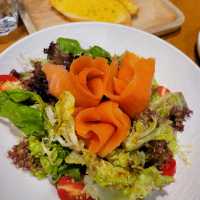The facade is decorated with wood and warm yellow light. You can also bring your baby 🐾 to experience the relaxing time with friends. The comfortable environment makes people relax physically and mentally. It is a good choice! Simply chose the meal for two The potato cream soup was quite hot and thick enough to fill every bite with fragrant potato flavor, served with garlic crispy toast. Smoked salmon Italian balsamic dressing salad The smoked salmon is smoky and not overly salty, the vinegar salad dressing is fresh and not greasy, the taste is sour, and the salad vegetables are refreshing and light. Hand-shaked seafood platter with secret sauce (Boston Lobster, Prawns, Octopus, Mussels, Mussels, Potatoes, Corn): Large plates are delicious. Secret sauce tomato sauce mainly has slightly spicy more appetizing Ordered two glasses of red and white wine to enjoy slowly Blueberry cheesecake to end #WeekendExcursion #Petfriendly #cafe #HandshakeSeafoodPlate withSecretSauce #HongKongGood Places