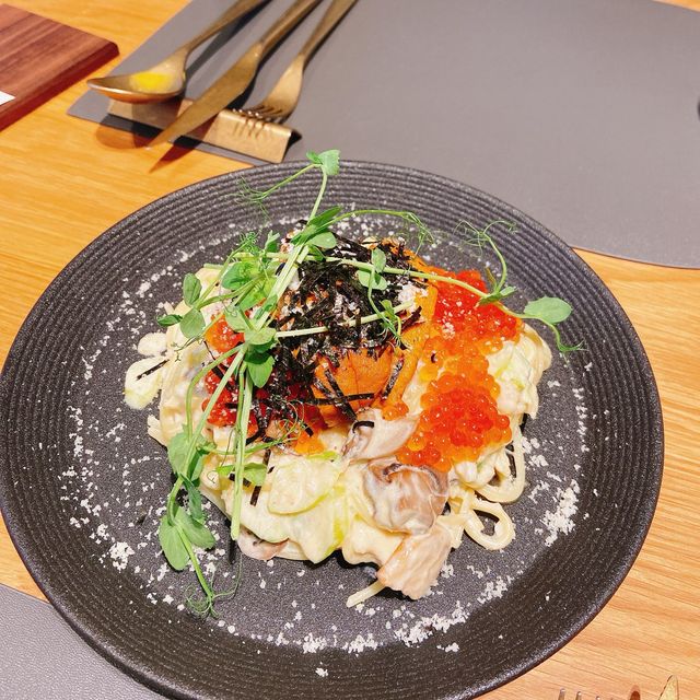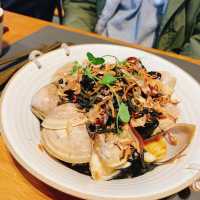 The restaurant collaborates with the Japanese-Thai solid wood furniture store ALOT Living. Wooden decoration, high ceiling, sense of space, soft lighting, great for checking in 😌 · 🩷Japanese soup Tangyuan likes this soup with crispy buns. It tastes good. It would be better if it was a little thicker. 🩷Fresh sea urchin, asparagus, crab meat, salmon roe and cream sauce pasta The food is fresh and the sea urchin lovers are excited😍 🩷 Today's Featured The clams are cooked to perfection, cleaned and large with only meat 🤤 and go well with squid noodles 🩷 Beef short rib dumplings🥟 (5 pieces) with grapefruit vinegar sauce The dumpling skin just covers the beef short ribs and tastes great. Adding grapefruit vinegar makes it a little refreshing. · Children's tableware✅ Overall a pleasant meal, you can visit again~ · 📍Relish Kitchen by ALOT Address: Shop L316, 3/F, AIRSIDE, 2 Concorde Road, Kai Tak, Kowloon City Transportation: MTR Tuen Ma Line Kai Tak Station Exit C #relishkitchenhk #airside #Eat in Kai Tak #hkfoodies #ChristmasDestinations