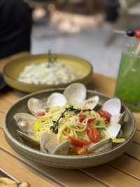 I'm stressed at work these days 🥹 and I really need to relax and rest! Last Friday I met a few friends for dinner, let's chill and relieve stress🧡 We went to a camping-themed restaurant in Kwun Tong🏕️ There will also be a live band🎵🎶🎸 on Friday and Saturday nights Eating, chatting, listening to music, very atmospheric🥳 There was also a small game section in our place that night, the clerk went to each table to guess the bag, cut the throw, guess and win a dessert 😂✌🏽 The shopkeeper is very witty and humorous 🤣 so whether we win or lose, being able to play like this has made us very happy 🤣🤣 I really like the environment of the restaurant🥰 The camping decorations are very thoughtful! For example, all are camping tables, camping stools, it feels like going to the countryside🤭 There is also a campervan in the restaurant, there are seats inside to dine, the atmosphere is really super good ❤️ see many families will come to dine 👨👩👧👧 ❥ Black Truffle Assorted Mushroom Pasta $148 The top is covered with slices of shredded cheese, and has a rich black truffle flavor😋 The rice is soft and hard, all the rice is covered with sauce, creamy enough to eat🤩 Very high quality Risotto👍 ❥ White wine vanilla butter mussel pasta $148 The whole plate of pasta is surrounded by mussels🤭 There are many portions of mussels, each one is fresh and plump, and it tastes very refreshing💕 The pasta with garlic slices and tomato slices exudes a slight garlic + white wine aroma, and with a little fresh feeling, good ~ ❥ Hawaiian Pineapple Salad Sausage Pizza $108 The pizza base is crispy! There is a lot of cheese🧀 and pineapple🍍 on top It tastes fresh and rich in taste🫶🏼 Remember to eat while it's hot 🍕🥰 ❥ Black Truffle Fries $68 Freshly fried and hot, the fries are fried very crispy, the surface is dipped in dots of black truffle sauce🤩 Served with truffle sauce and ketchup, it's so delicious that you can't stop eating😋 ❥ Thai Glutinous Rice Stuffed Chicken Wings $88 Highly recommended 😍😍 There are 4 in total🍗 each has a lot of meat🤤 The chicken wings are crispy and delicious on the outside, and are wrapped in fragrant glutinous rice. They are smoky and tough. They are delicious enough! ❥ French Vanilla Lemon Butter Clams with Sourdough Bread $158 The mussels are big and full of freshness! The sourdough bun is so fluffy🤤 Absorb the vanilla lemon butter juice 🧈 full of aroma😍 ❥ Hot Hazelnut Coffee $38 The latte art on the coffee face is beautiful! Need to check in🤭 The coffee is rich and smooth ☕️ Hazelnuts taste sweet and milky 💕 ❥ Iced Rose Coffee $43 What a cup! The taste is soft and smooth, every sip you can drink the rose flavor, very refreshing 🌹 ❥ Youth Peach $48 ❥ Lime soda $32 Large cup ~~ Both cups are full of bubbles 🥰 Great for quenching thirst and relieving thirst! 📍Camp for four seasons G/F, Chung Fu Centre, 86 Hong Tu Road, Kwun Tong #hkfoodie #hkfoodblogger #hkblogger #hkigfood #hkmicroinfluencer #hkkol #hkinfluencer #yummyfood #camping #hkcamping #hkigfoodie #eatwithfoodiez #chillvibes #liveband #hkrestaurant #hkliveband #rice gathering #Christmas places
