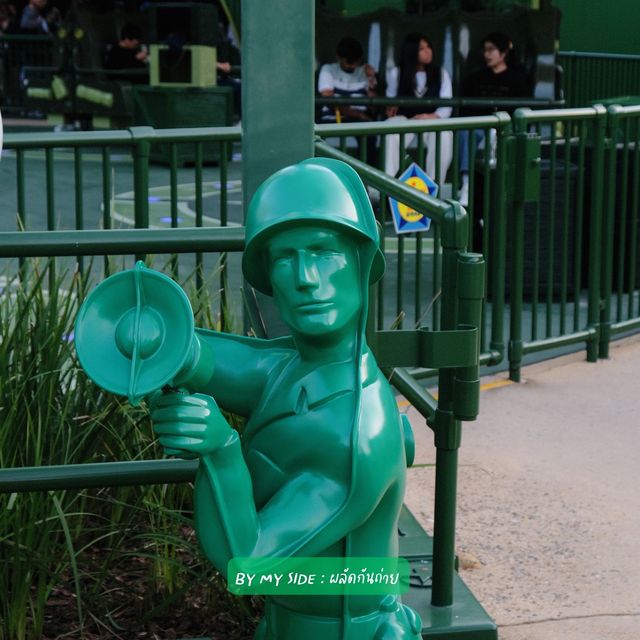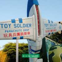 - 40-minute wait time - Big drops, Thrill rides - This ride lets you play as Green Army Men, parachuting from the sky. The ride gradually climbs up a pole, giving you a bird's-eye view of the theme park. Then, it plummets vertically. The descent is a bit scary, but it's not too fast. - There's a luggage rack near the boarding area, so don't worry if you're carrying a lot of luggage. - Seats are 3-person. - Rating: 5/5 #travelabroad #secretlocation #beautifulphotospots #beautifulphotospots
