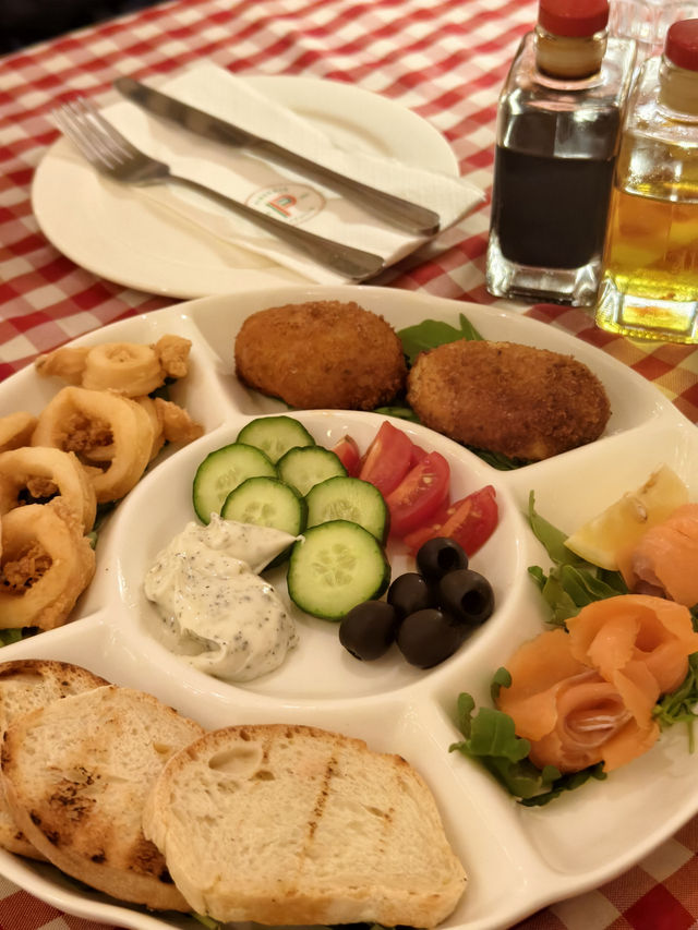 Regular Gabino Pizza $178 Lasagna Di Carne $148 Platter Lime Soda Iced Chocolate Deliciousness: 😋😋😋😋 Value for money: 💲💲💲💲💲 Comfortable environment: 😌😌😌😌 Cleanliness: 🧹🧹🧹🧹🧹 Service quality: 💁🏼♀️ 💁🏼♀️ 💁🏼♀️ 💁🏼♀️ My husband loves pizza🍕, so we often visit different restaurants to try their pizza. This time, we went to this Italian🇮🇹 restaurant in Sai Ying Pun. Besides food, the restaurant also offers a variety of alcoholic drinks🍷🍺. On Friday night, the restaurant was packed, and the atmosphere was great. We ordered three dishes and two drinks. The appetizer platter included smoked salmon, creamy croquettes, bread🥖, fresh cucumber🥒, cherry tomatoes, and crispy fried calamari rings. The calamari rings taste even better with a bit of black truffle salad dressing. The Regular Gabino Pizza had a thin crust, making it crispy. The pizza was generously topped with tomato sauce and cheese🧀, along with savory Spanish sausage, bell peppers🫑, onions🧅, and delicate Parma ham. The Lasagna was rich and juicy. The meat sauce was slightly sweet, the white sauce had a hint of milk flavor, and the taste was layered. The cheese was fragrant and creamy. Although lasagna is indulgent, it is truly a comfort food. —— Pizzeria Italia 📬G/F, 46 High Street, Sai Ying Pun, Western District