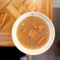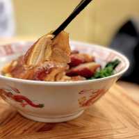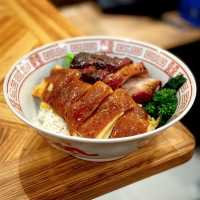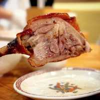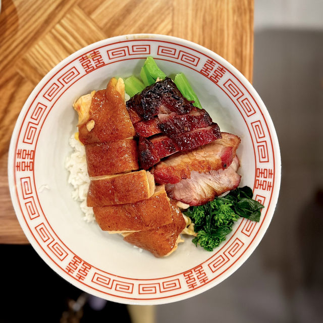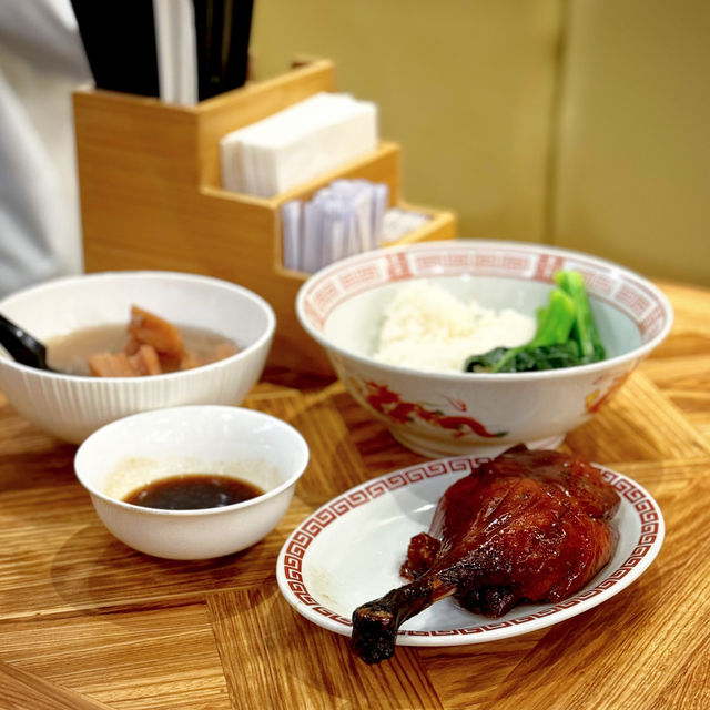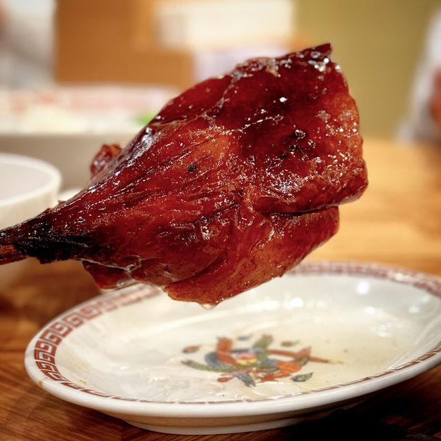 Hong Kong-style roasted meats are definitely an indispensable delicacy for Hongkongers! I've loved eating them since I was young, especially char siu, which is my comfort food. This time, I went to a fairly famous roasted meat specialty restaurant in Wan Chai to see if it could win my heart. Fat Tat Char Siu in Wan Chai has quite a reputation! It’s a roasted meat specialty shop opened by the owner of the local Feng Shan Private Kitchen. I heard it was very popular, so around 6 PM that day, my dad and I came for dinner. Luckily, the last two seats were available, so we didn’t have to queue. The open kitchen is clearly visible, with roasted goose, char siu, and soy sauce chicken hanging inside. These three are also our favorite roasted meats, so we decided to try them all. The small shop was packed, making sharing tables a common sense! We ordered two bowls of roasted meat rice, each served with a bowl of old fire soup. That day, we got kudzu soup, a thick and rich soup with a fragrant and sweet taste that clearly showed the quality ingredients. Dad chose his favorite roasted goose leg rice for $100. The price is surprisingly reasonable for a goose leg! The roasted goose leg had crispy skin and fragrant meat without being too fatty. The seasoning wasn’t overpowering, allowing the natural flavor of the goose to shine, which I liked. I chose my favorite unbeatable combo: char siu and Maotai soy sauce chicken rice for $80! We both ordered extra rice, but the portions weren’t large! After a few spoonfuls, the rice was all gone. For those with big appetites, it might not be enough. First, I tasted the char siu with slightly charred edges, evenly balanced fat and lean meat, and a distinct bite. The flavor was moderately salty and sweet, perfectly seasoned. If I had to be picky, I’d say it was a bit sticky, but otherwise, this char siu was genuinely good. The Maotai soy sauce chicken was definitely the MVP! The smooth, non-greasy chicken skin carried a full aroma of Maotai and soy sauce. The chicken meat was tender and flavorful, an outstandingly delicious taste. The prices at Fat Tat Char Siu aren’t cheap, but the quality is good, so I think it’s reasonable! The staff cleared tables very diligently but also made me feel a bit pressured. I believe takeout would be a more comfortable way to enjoy the food.