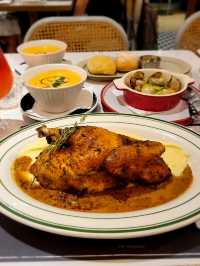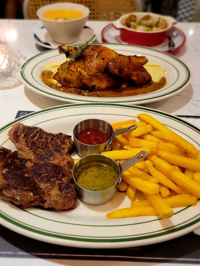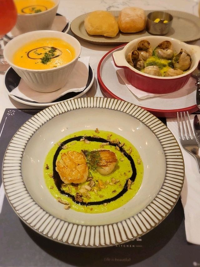 Visited the French-style restaurant Odelice💙, where the floor is laid with black and white tiles🖤🤍, decorated with floral patterns and wall paintings🌸🖼, giving a vibe just like being in Paris🌹 The dinner set for two includes soup🍲, bread🥖, two appetizers or desserts, and two main courses🐥🐄. We also ordered cocktails🍹, so good c'est la vie. 💛Pan-seared scallops: large and thick, fresh and bouncy, paired with fresh pea purée for great flavor. ❤️French baked escargot: truly has that French flavor. 🐥French roasted yellow chicken: a real surprise, beautifully roasted, the meat remains tender and juicy, and the truffle mushroom sauce is excellent. 🐄Argentinian Angus ribeye steak: rich Argentinian beef flavor, very juicy, paired with Paris butter sauce for a special touch. 📍Odelice! Shop 628, 6th Floor, Phase 1, New Town Plaza, 18-19 Sha Tin Centre Street