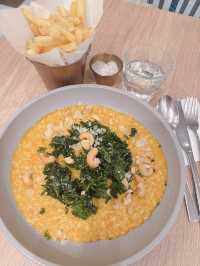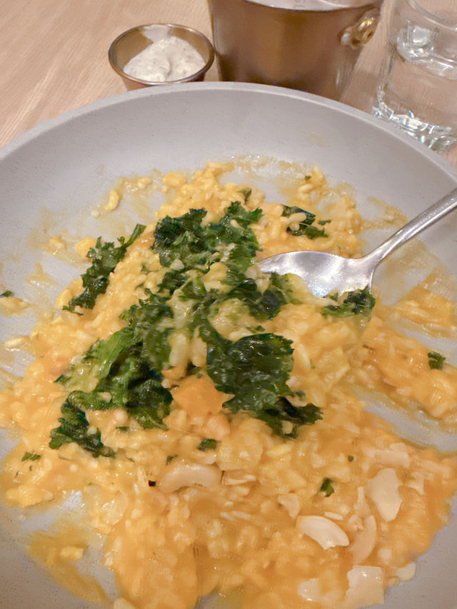 Affordable, Delicious, and Heartwarming Cafe Passed by Douzi and saw a Dinner Set that’s really good value—$138 for an appetizer + main course + cake/dessert + drink🍸. There are plenty of choices for both main and appetizer. I chose the black truffle egg yolk sauce fries + pumpkin kale cashew risotto, and for dessert, I picked the American-style rich molten chocolate cake🍰. ✨ Black Truffle Egg Yolk Sauce Fries ✨ Crispy fries fried to perfection paired with black truffle sauce—really tasty😋. ✨ Pumpkin Kale Cashew Risotto ✨ This risotto is quite generous, full of pumpkin flavor, combined with cashews and crispy fried kale, which goes really well together. ✨ American-Style Rich Molten Chocolate Cake ✨ Very rich chocolate flavor. ✨ Lemon Honey🍯✨ The flavor is as expected. The total bill was $152, really good value and delicious. Also, I really like that the cafe has a "Friends Program" hiring a group of elderly friends to work there. From the moment I entered to when I sat down, the elderly friends greeted me warmly with smiles👍. Support this loving cafe. Like my sharing? Remember to like 🩷 + Follow📌 me! 🔸Douzi (Tai Po)🔸 📍Shop 670a, 670b, 671, 1st Floor, Area D, Tai Po Mega Mall, 8 & 10 On Pong Road, Tai Po daily