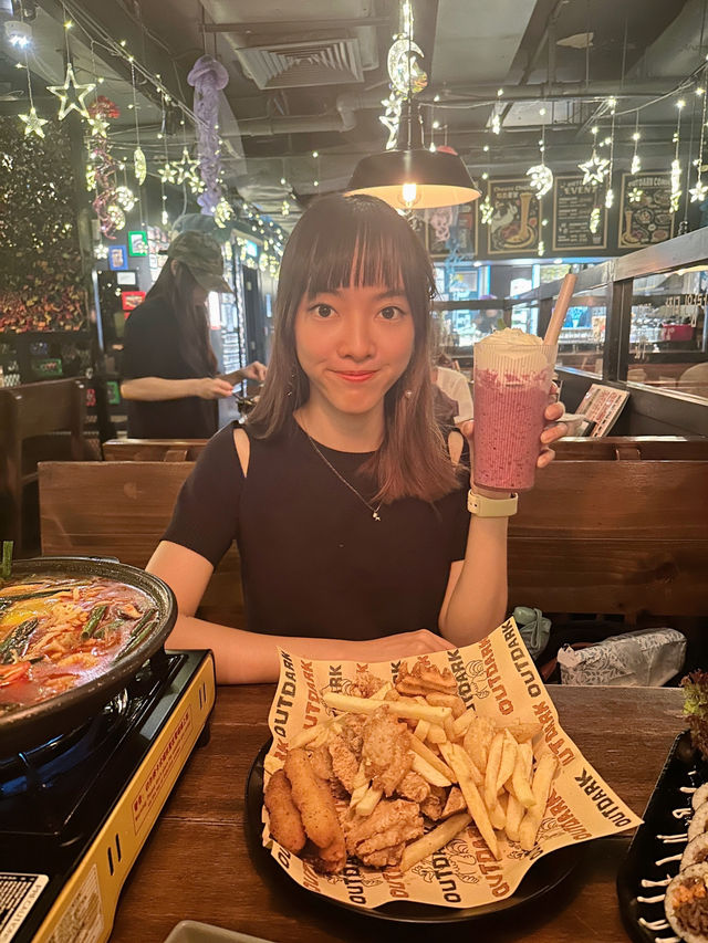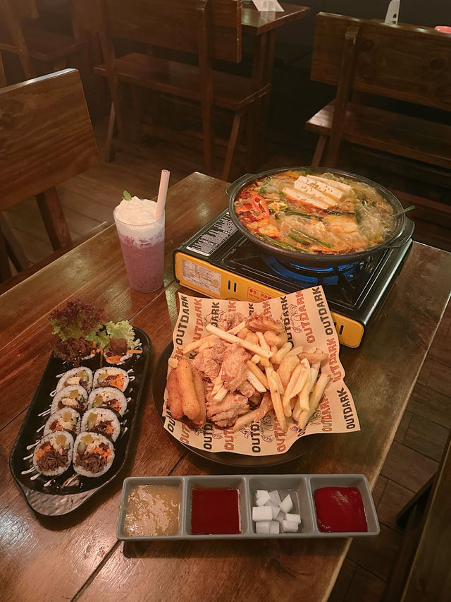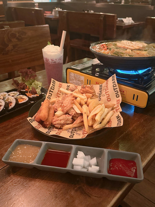 Weekend early in the morning with friends to "Outdark" queue to eat fried chicken 🇰🇷 。 ⚠️This restaurant charges 10% service charge💰 。 Spicy tofu soup udon 🍲 single order $ 228 💰 soup slightly spicy 🌶 ️ tofu smooth and tender 🤍 udon bouncy 🍜 There are eggs 🍳 squid 🦑 shrimp 🦐 onions, meat slices 🥩 small mussels 🐚 mushrooms 🍄 🟫 very satisfying 😛 。 Original Fried Chicken (Half 250g) + Sweet Potato Cheese Strips (3) 🍗 Single Order $166💰Boneless Fried Chicken Crispy and Tender on the inside😆 Keep the juices🤤 Can be dipped in the attached pickled carrots, garlic sauce🧄Sweet and spicy sauce, tomato sauce🥫 Served with potato wedges, potato grills, cheese powder French fries🧀🍟Butternut cheese strips with sweet potato cheese🍠 。 Grilled beef rice rolls 🍙 single order $98 💰 seaweed wrapped in white rice 🍚 grilled beef 🐄 cucumber 🥒 carrot, burdock, carrot 🥕 egg 🥚 beef with charcoal aroma 🔥 large and full of ingredients 😋 。 Korean dried 🍪 free gift 💰 。 Blueberry Yogurt🫐 Single Order $48💰 Made with fresh blueberries and yogurt👍🏻 。 Selfie machine📸Free💰 。 Postcard sending service📬Free💰 Outdark 地址: 📍2/F, Feida Business Centre, 613 Nathan Road, Mong Kok #Outdark #MongKok #MongKokFood #MongKokGood Places #MongKokRestaurant