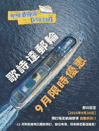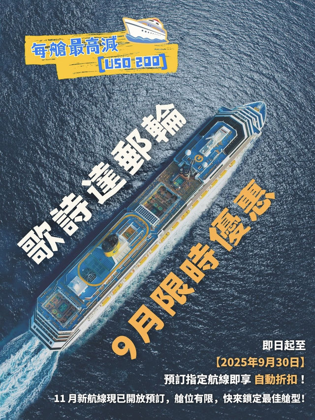 ✨Limited-Time Discount | Book in September and Enjoy Exclusive Offers From now until September 30, 2025, book select cruises to receive an automatic discount! ✅ USD 100 per person, up to USD 200 per cabin ✅ Applicable Cruises: ➤ Costa Serena: Departs November 21, 2025, to January 31, 2026 ➤ Costa Tuscany + Costa Smeralda: Departs December 1, 2025, to February 28, 2026 🌏New Cruises | Costa Serena's November sailings take you to four destinations! 🚢 8-Day, 7-Night Dream Itinerary: 📍 Hong Kong → Embark on a bustling Victoria Harbour nightscape 📍 Keelung → Enjoy night market dining and explore Jiufen Mountain Town 📍 Jeju Island, Seogwipo → Volcanic islands and azure coastlines 📍 Busan → Explore Korean fashion and seafood markets 📍 Yatsushiro & Nagasaki → A dialogue with history 📍 Return to Keelung & Hong Kong → Return home laden with memories ⏰ With precise daily port calls, explore by day and sail amidst the stars at night! 🌟Why Costa Cruises? 1️⃣ Experience Italian luxury: Europe's largest cruise brand, blending art, cuisine, and romance. 2️⃣ Fully upgraded: Newly renovated after dry docking, guest rooms, restaurants, and theaters have been completely upgraded! 3️⃣ In-depth Asian adventure: Experience the best of four destinations on one itinerary, without the hassle of connecting flights! 4️⃣ Family-Friendly: Club and Family Rooms are perfect for families! 🎯Book now! ✅ Discount valid for September bookings only, limited space available! ✅ New itineraries departing in November, early bird access to the best available rooms! #Costa Cruises #NewAsianRoutes #CruiseTravel #LimitedTimeDiscount #DepartingHongKong #Keelung #JejuIsland #Pusan ​​#Nagasaki #AutumnTravel #SailDiary
