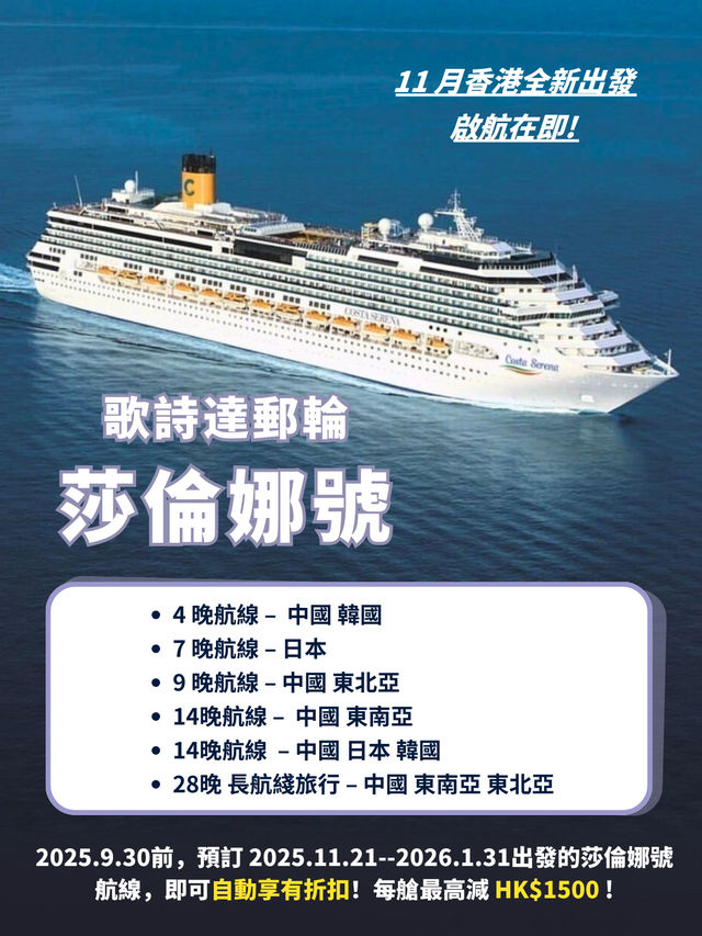 🚢 Departure: Costa Serena will begin her 2025-26 Winter Asia itineraries on November 12, 2025! 🏗️ ​​Ship Upgrade: Dry-dock refit completed at the end of October 2025, featuring a new Olympian Gods-themed environment, new culinary experiences, immersive entertainment, a spa, and redesigned suites. 🌏 2026 Annual Plan: Serena will be stationed in Asia year-round, rotating two 14-day itineraries (Japan + Taiwan + South Korea; Vietnam + Thailand + Singapore + Brunei + Philippines), which can be combined into a 28-day immersive Asia itinerary. A circumnavigation of Asia, Oceania, and South America will begin in October 2026. ⏰ Itinerary Period: November 2025 - February 2026, departing from Hong Kong, Singapore, and Tokyo. ‼ ️Departing from Hong Kong — Sharena winter route discount booking now! ️ Featured Routes: 1. 4-Night China & South Korea Cruise - Price: From HK$2,854 - Departure: November 12, 2025 2. 7-Night Japan Cruise - Price: From HK$6,398 - Departure: December 19, 2025, January 16, 2026 3. 9-Night China & Northeast Asia Cruise - Price: From HK$5,024 - Departure: November 12, 2025 4. 14-Night China & Southeast Asia Cruise - Price: From HK$11,117 - Departure: December 5, 2025, January 2, 2026 5. 14-Night China & Japan & South Korea Cruise - Price: From HK$11,339 - Departures: November 21, 2025, January 16, 2026 🎁 Costa Cruises' September promotions are still ongoing! Book by September 30, 2025, for a Serena cruise departing between November 21, 2025 and January 31, 2026, and automatically receive this discount: ✅ HK$750 off per person, up to HK$1,500 per cabin!!! Discover your own exclusive cruise now and embark on a warm winter sea adventure! 🚢❤️ #CostaCruise #CostaSerenaCruise #HongKongCruise #CruiseTravel #LimitedTimeOffer #Cruise #WinterTravel