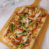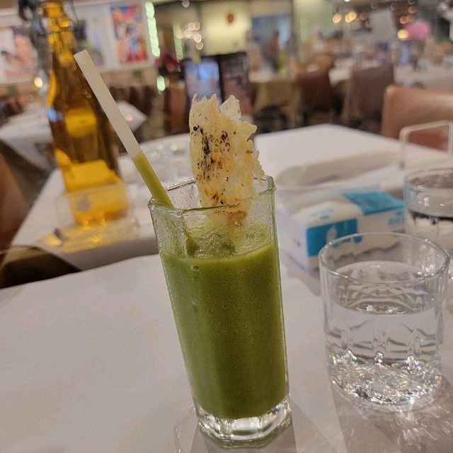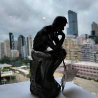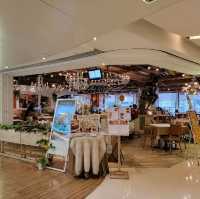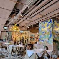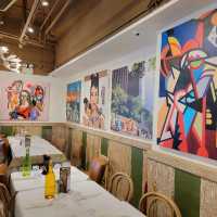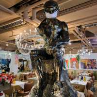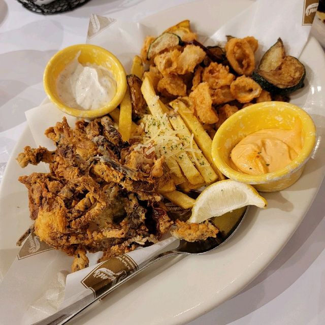 Amaroni's has opened a new location on the fifth floor of Moko in Mong Kok's Grand Century Plaza, just off Mong Kok East MTR station. Specializing in New York Italian cuisine, the restaurant boasts the same luxurious decor as always. The restaurant features the iconic large "The Thinker" sculpture, which, for the sake of humor, is even wearing a mask during the pandemic. Each table also features a small "The Thinker" sculpture, adding a touch of playfulness. The crystal chandelier adds a touch of grandeur to the restaurant, and the curtains lining the floor-to-ceiling windows are decorated with paintings depicting New York and Italian styles. Unfortunately, we went during afternoon tea and were seated in front of the window, where the UV rays were very strong. We politely asked the staff to draw the curtains, but they refused, saying the curtains were fixed. They suggested we move seats, but then we saw four staff members sitting in the booths with the curtains drawn next to them. This was a bit off-putting. 😂 Back to the point, the food was generally good, especially the signature platter, which was a pleasant surprise: four soft-shell crabs, cuttlefish tips, and fries. The portion was generous and absolutely amazing. The pizza is also highly recommended. The thin crust is unlike typical pizza places, with a soft yet crispy texture. The color and flavor are both top-notch. 👍 As for the Caesar salad, 🥗, you can choose between shrimp or chicken. We opted for shrimp, but unfortunately, the first time they served the wrong chicken. When we asked for a replacement, we were met with a bit of skepticism and a sullen look. 😂 We're absolutely certain the waiter made a mistake and, hopefully, a replacement. However, the salad was clearly the same, with the chicken removed and three pan-fried shrimp placed on top. The flavor was decent, but the portion was generous. ✌️ The complimentary bread basket was a pleasant surprise. 😍 It was delicious with the olive oil. 👍 #Check-inRestaurant #Thinker #NewYorkItalianFood #ServiceCanImprove