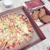 When I traveled to Japan, I loved eating Japanese convenience store fried chicken. I haven't been able to find anything similar in Hong Kong. Recently, a friend said that PHD's fried chicken is delicious and tastes like Japanese fried chicken! So try it now! I rarely eat this pizza, but this time I tried it and thought the pizza was good, with enough cheese sauce! Also buy enough for a certain price, there is a free meat sauce pasta, the pasta is relatively wet, and the usual baked pasta something different! The main character appears, this time I try this is golden fried chicken. The golden egg yolk flavor is not very strong, the skin is not very crispy, but the meat is very tender and smooth, really like Japanese convenience store fried chicken! Another choice for fried chicken next time! PHD Pizza Tsz Wan Shan Center #food recommendation