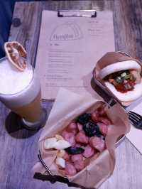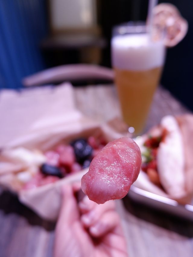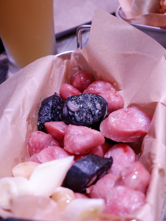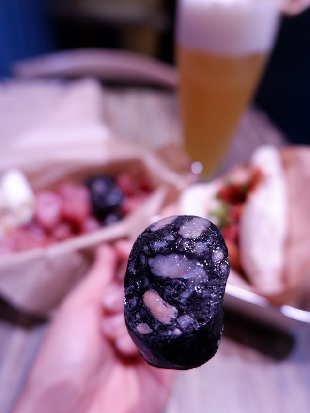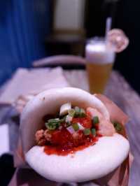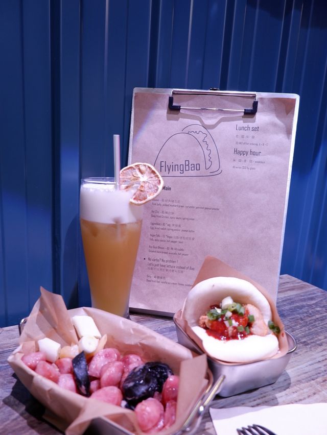 Gua bao, also known as gua bao, is a Taiwanese delicacy. I've never had it in Taiwan, but I did have it once at Kwai Kwong Shopping Centre in Hong Kong. I was surprised to find a small bar specializing in gua bao in Central. Location: Above the famous mural on Graham Street, you have to climb a staircase to reach it. There's a sign hanging over the door. Environment: The indoor space is small, with window seats and a wooden table for four. The walls are made of blue tin, and the lighting changes to purple. The bar and kitchen are located in the back, making it a simple upstairs bar. Service: The food is served quickly! Lunch: Specializing in Taiwanese gua bao, they offer a set menu with snacks and drinks. 🥢Spicy Taiwanese Girl🌮 $65 Comes with fried chicken🍗, chives, and homemade chili sauce. The ingredients are simple, but the highlight is the super soft gua bao😍, which has a smoky, chewy texture with a hint of milkiness. The chicken is crispy on the outside and tender on the inside. The portion is not large. 🥢Sausage with Garlic🧄 $50 A serving of sliced ​​cuttlefish sausage and original pork sausage, served with a few slices of garlic and scallions. The sausages were lightly fried and crispy, and the cuttlefish was especially delicious 😋. This was my first time having cuttlefish sausage, and it was fantastic! 🍸KGP $55 A cocktail made with sorghum, pineapple juice, and green tea🍵. It's sweet with a hint of pineapple 🥰, has a low ABV, and is very smooth, perfect for a girl! ☺️ Flyingbao 📍Shop C, G/F, 49 Graham Street, Soho, Central #LocalTravel #HongKongDestinations #HotSummerDestinations #foodie #SummerFoodRecommendations #CentralFoodies