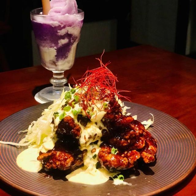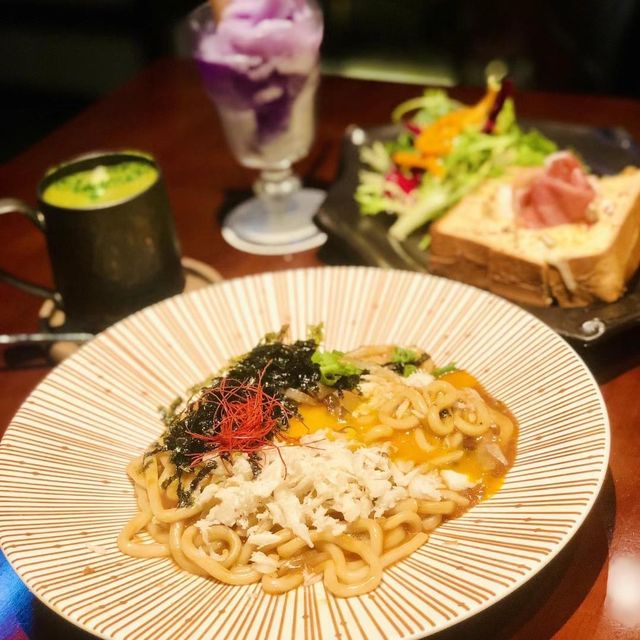 The restaurant is decorated in Showa Western style, with dark brown wood, bookshelves at the door, maple trees, and porcelain cutlery full of retro colors. Although we are about to travel to Japan, there are still so many people queuing up at the restaurant entrance as always. Sit down and order two drinks first. [Matcha Fresh Milk Coffee] is filled with traditional matcha drinks in ceramic cups, which is very retro. Drinking matcha taste super rich, warm to the heart makes people feel comfortable and relax. [Cloud Shake] The purple + white combination is quite like the color of the evening sky. It's actually a yogurt shake. It's refreshing to drink in hot summer. Egg-wrapped rice is a must when we go to Japanese restaurants, so we chose the signature [Japanese red wine stewed beef egg-wrapped rice]. The eggs are fried into olive shapes, shining golden brown under the spotlights. The shopkeeper cut the eggs on impromptu, and the egg batter slowly flows out. Pour into the red wine sauce, which is fragrant. The stewed beef flavored with red wine sauce is super rich and soft, and paired with the egg flavor, it's really a human delicacy. [Tamako Crabmeat Fried Udon] Mix the crab meat, shallots, shredded seaweed and egg sauce together. The sauce is rich in crab flavor, and there is no shortage of crab meat. With the smooth egg sauce, the flavor is very rich. It's perfect for me who likes crab and eggs. [Namman Fried Chicken] The fried chicken dipped in Namman vinegar is shiny dark brown and tastes a bit like sweet and sour bone. We hung out and chatted for a while before eating, but the chicken was still warm and tender. If you think the taste is too strong, you can eat it with shredded cabbage to reduce the greasiness. [Rock-grilled cheese] The super thick sandwich is topped with a layer of golden cheese, sprinkled with some chopped shallots, and built like a flower ham, which looks good. The toast is fluffy and the cheese is soft, but be sure to eat it while it's hot, the taste and texture will be a little worse when it's cold. [Honey Pineapple Cream Sandwich] For dessert, I chose one with fruit, which is called healthier. The pineapple is quite juicy, and there is honey and cream, three different sweets, together and quite good. Overall, the restaurant environment, food appearance, and taste are satisfactory, no wonder so many people line up. Drinking teaちょうぼ 📍Shop 276, 2/F, Tai Po Super City, Area B, 8-10 An Bang Road, Tai Po #choubokissaten #cafe #halloween2022 #foodie