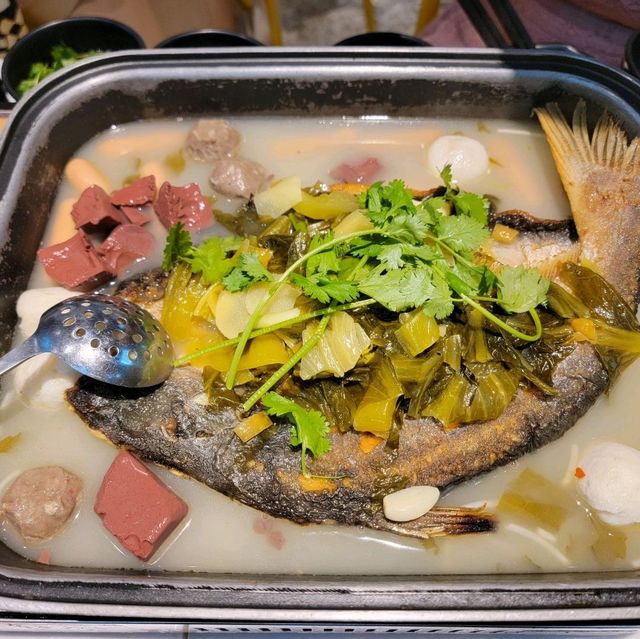 Located in Yuexiu Plaza, San Po Kong, the Sad Hot and Sour Noodles All-you-can-eat restaurant. For two or more people, you can choose a chicken pot 🫕 or grilled fish 🍲 as the soup base, a variety of ingredients 🥟🍥🥬🥕🥗 to eat, and unlimited soda 🥤🧃 and tea ☕️. Only $108 per person, even cheaper at designated time, $88, no extra charge, it's a great deal 👏 #foodie #chickenpot #grilledfish #all you can eat