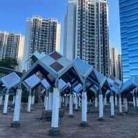 The weather is good today, with sunshine. I came to Quarry Bay Park. It's really big! The feature of the bay is a rest area built in the shape of a dice🎲, with benches for everyone to sit on, and a long running track, basketball 🏀 field, football ⚽ field and so on nearby... Cross the footbridge will come to the waterfront promenade, walk along the road to see the pet park, enjoy the whole lion mountain view and Kai Tak Cruise 🛳️ pier, refreshing sea breeze, lively waterfront, people coming and going, endless flow, rarely during the epidemic, there are many owners bring their pets to the park, add a scenery, enthusiastic laughter, full of hope.