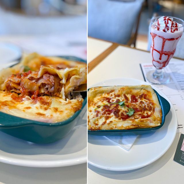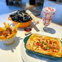 I went to Sai Kung last week and visited this cafe in WM Hotel again☕️! The last time I visited was to celebrate my birthday🎂 I already felt that the environment was very open and comfortable🍃 The space between each seat is good🫶 - This is a sports-themed restaurant. It not only broadcasts live sports games, but also has billiards🎱, simulated golf⛳️, football machines and pinball🕹️. The food is mainly Western food, pasta🍝, hamburgers🍔, and fries. It tends to be fast food, and the most famous is its signature soufflé and waffles🧇 🔻🔻🔻🔻🔻 ✨ Mussels Pot ($168) Fresh fennel cream cooked blue mussels. The number of mussels is quite large and quite tasty, but a little bit not plump enough. Served with a piece of toasted bread stick 🥖 The texture is soft and cooked. Dipping it in cream sauce is even more delicious 😚 - ✨ Pulled Pork Lasagna ($155) I have eaten a lot of minced beef lasagna, but this is the first time I have eaten slow-cooked shredded pork filling. 🐷 When you cut it open, you will see layers of shredded pork, which is mouth-watering! 🤤 I like the sour cabbage mixed in it. 🌱 And the tomato sauce is mixed with herbs, which makes the lasagna more sweet and sour~ - ✨ Mozzarella Gravy Chips ($59) Highly recommended🌟 I didn't expect the fries here to be such a surprise🍟 The outer layer of the fries is fried so crispy, and there is a hint of potato puree when you bite it. Gravy and Mozzarella cheese are sprinkled on the top, and it becomes a stringy effect when you pull it🧀 - ✨ Strawberry & Custard Waffle ($145) It consists of two layers of waffles. The waffles are crispy and have a soft texture. There are sweet strawberries on top. Smooth custard sauce is added in the middle. But the portion is a bit too much. I didn't expect much from the waffles at first, but it tasted good overall. - ✨ Strawberry Milkshake ($64) Wicked choice😈 Rich and sweet strawberry milkshake🍓🥛 Overall a bit sweet but very satisfying🤣 🔺🔺🔺🔺🔺 🔸Environment: 4.5/5 🔸Value for money: 4/5 🔸Service: 5/5 🔸Return rate: 5/5 🔸Waiting time: No waiting time on Saturday at 3pm (You can also make reservations by phone in advance) - 📍M Square (Saigon) 🗺️ Shop A1, LG/F, WM Hotel, 28 Wai Man Road, Sai Kung - #Your likes and follows are my motivation🙆🏻‍♀️ Like & Follow @mageatallday 👈 #Not a single second is hungry #mageatallday #mead西宫 #mead西式 #香港好地方 #foodie