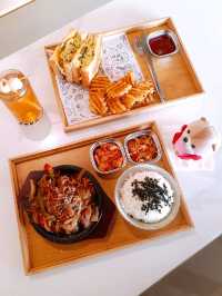 Came here again for lunch. During the day, you can sit by the window and enjoy the view of Victoria Harbour. You can slowly relax and have lunch. It’s a leisurely and enjoyable feeling. This time I saw that the menu has been changed, with a lot of new dishes and drinks added 😛. - 💥Hot chocolate coffee HKD$58, the drink has the store’s signature doll on top, although there is no latte art but it’s still special. The chocolate taste is rich and the coffee tastes aromatic and not sour. The two flavors go well together, refreshing and invigorating. - 💥Lychee Oolong Tea HKD$1, this drink has a preferential exchange price, and there are two lychees on the top of the drink with a small bamboo stick. The drink has a strong tea flavor, a fresh taste and is not too sweet. Drinking it in this weather gives you a refreshing feeling. - 💥Pork set meal HKD$138, this meal comes with two Korean appetizers, the ones of the day are kimchi and bean sprouts. The pork is served on an iron plate, which can keep the food temperature and smell delicious😍. The pork meat is tender and smooth, with a chewy and tasty texture. Even the ingredients inside are very tasty, and it is great for mixing with rice🥰. - 💥Truffle and white mushroom omelette toast HKD$138, this tastes very fragrant😍, eat truffles while eating omelette, it is very smooth and has a rich flavor. The toast is crunchy and not greasy. Normally, the outside of toast is hard, but here it is not hard and is very soft 😆. - 💥Souble-lime pancake with chamomile and grapefruit sauce HKD$138, the souffle pancake looks good and feels healing when shaking it🙈. The egg flavor is rich and melts in your mouth, and paired with the sweet and sour sauce, the taste is even more appetizing 😋. The overall taste is good. - The food and presentation are good, and the prices are average. You can also redeem designated food/drinks at a discounted price when you order a certain amount. - 📍Qinna Baichuan Shop LCX34, 3/F, Ocean Terminal, Harbour City, 3-27 Canton Road, Tsim Sha Tsui #romanticdaterestaurant #cafe #foodie