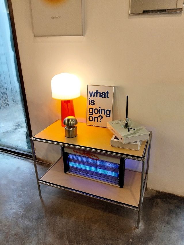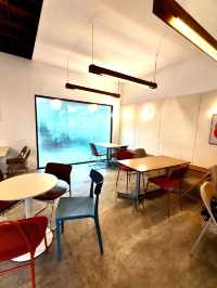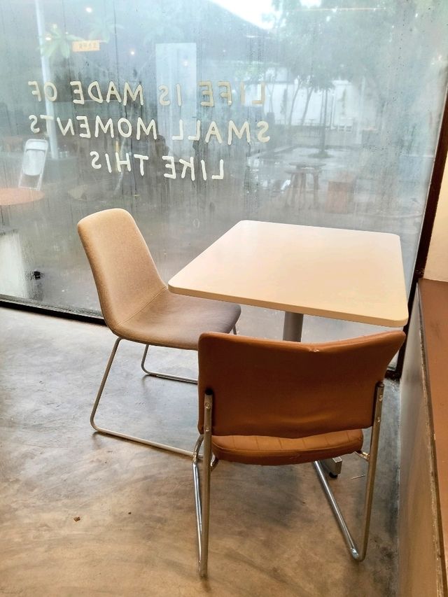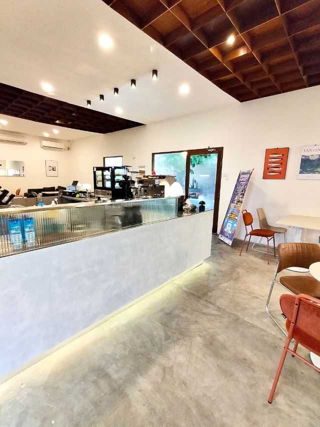 #hellohalloween The focal point is the long, sleek counter that dominates the left side of the frame. It features a textured, light gray or off-white front panel with a subtle, glowing under-lighting strip, adding a contemporary touch. The countertop is protected by a corrugated or textured glass barrier, behind which the coffee-making equipment and service area are visible. The counter's sharp angles contrast nicely with the softer textures and colors of the seating area. Above, the ceiling is a striking design element, featuring a recessed grid of dark wood panels, possibly for acoustic or purely decorative purposes, which adds warmth and visual complexity to the otherwise bright, white space. Recessed track lighting provides focused illumination. To the right, the seating area shows a mix of styles, suggesting a casual and comfortable environment. A few tables are present, surrounded by chairs in earthy tones of brown, terracotta, and burnt orange, which introduce a welcome pop of color. The flooring is a polished concrete, contributing to the industrial-chic aesthetic that is popular in modern cafes. The far wall features a framed print of an artwork or photograph, and a poster that appears to be related to a Van Gogh exhibition, adding a touch of cultural flair. Further back, a glass doorway leads to what looks like a brighter, possibly outdoor or naturally lit area, promising a nice view or a refreshing change of scene.