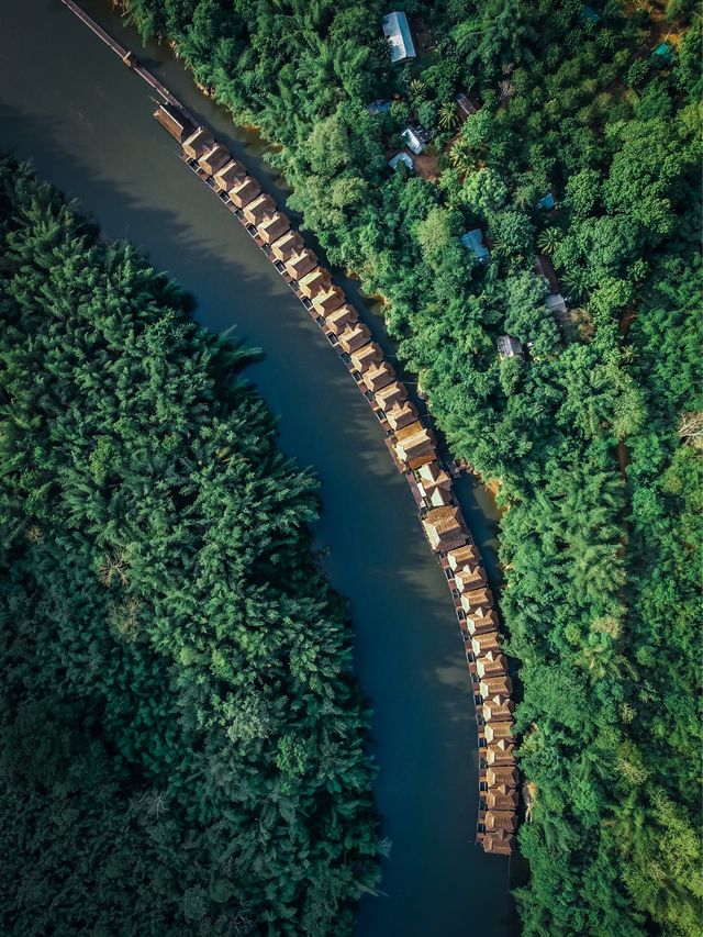 A floating raft hotel in the rainforest of Kanchanaburi, a dream floating on the River Kwai