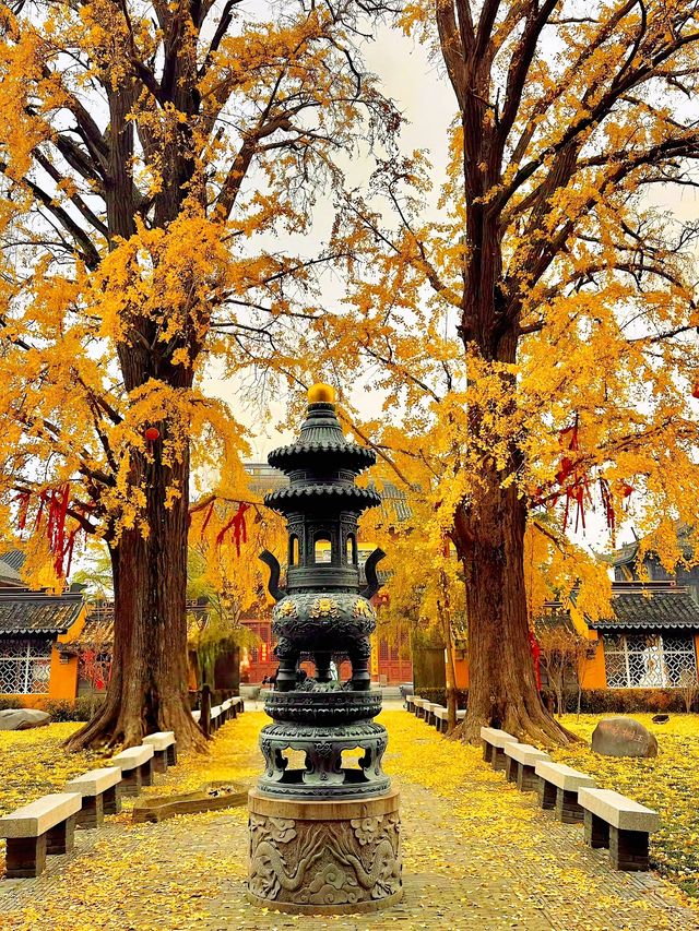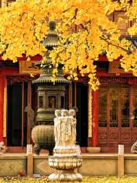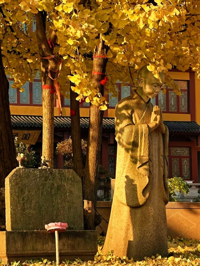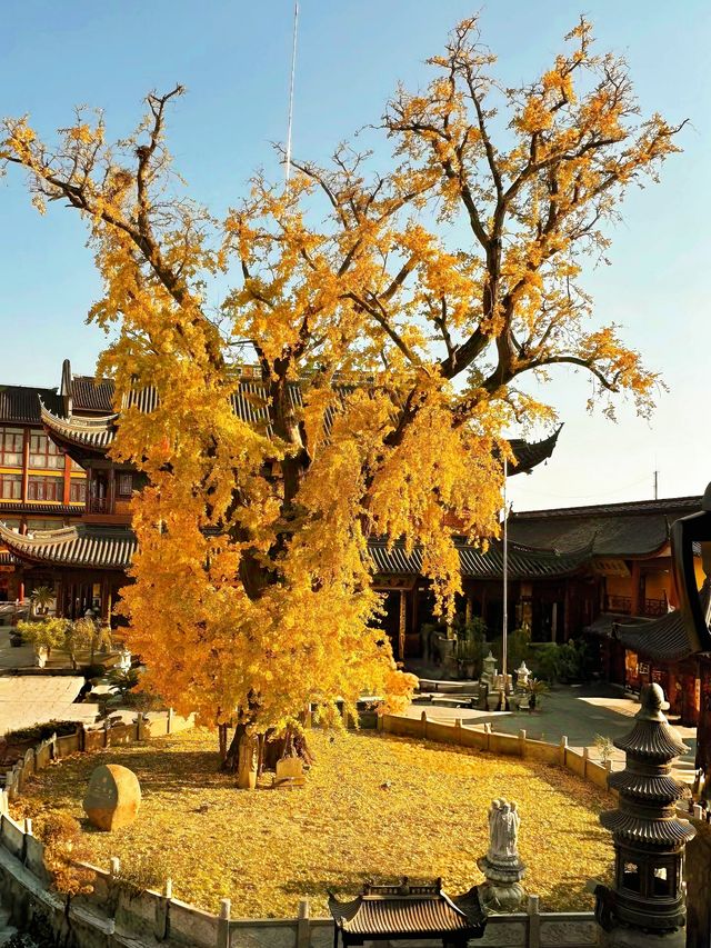For a thousand-year-old ginkgo tree, I came to this ancient temple in the suburbs of Shanghai, which is almost forgotten - Baoguo Temple in Qingpu! Baoguo Temple was originally called Guandi Temple, commonly known as Guanwang Temple. It was built in the Five Dynasties and Ten Kingdoms period and has a long history. It is a unique place that integrates religion, history, culture, and natural landscapes. When you step into Baoguo Temple, the first thing that catches your eye is the solemn and majestic architecture. The red walls and black tiles exude an ancient charm in the autumn sunlight. But what attracts my attention is the thousand-year-old ginkgo tree that I came for. The golden leaves are dazzling, and when they fall with the wind, they look like golden butterflies dancing, covering the ground like a golden carpet, forming a beautiful picture with the ancient temple buildings. In addition to this thousand-year-old ginkgo tree, the natural environment around Baoguo Temple is also very beautiful. It is located by Dianshan Lake, and the lake scenery complements the temple. 💁Important cultural relics and landscapes 1⃣Thousand-year-old ginkgo tree: Located in front of the Mahavira Hall, it is one of the eight existing thousand-year-old ginkgo trees in Shanghai. The tree circumference is nearly 6 meters, the height is 36.5 meters, the east-west crown diameter is 17 meters, and the tree age is over 1,000 years, making it the most famous ginkgo tree in Qingpu. 2⃣Stone sculptures of little monks: Many stone sculptures of little monks are scattered throughout the temple, each with a different posture and lifelike appearance. 3⃣Stone tablet: There is a stone tablet from the Chongzhen period in the temple, which is a testament to the long history of the temple. 4⃣Jade statues of Shakyamuni and Guanyin: Donated by Buddhist believers from Singapore in 1990, they are enshrined in the Guanyin Hall. 📍Address: No. 452, Dianfeng Village, West Dianshan Lake, Zhujiajiao Town, Qingpu District 🚇Transportation: Take Metro Line 17 to Dongfang Green Boat Station, exit from Exit 3, and transfer to Bus 4 or 7 to get there. 💁Travel tips: 1⃣The temple is a religious place, so it is recommended to dress appropriately and avoid wearing revealing or strange clothes. 2⃣The temple and its surroundings are open, so it can be quite cold in winter. Please keep warm. 3⃣The etiquette for worshiping Buddha should be correct, and respect for religious beliefs and customs is important.