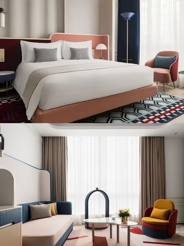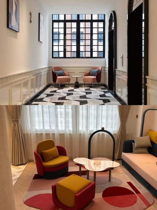 | Dramatic life on stage. The space of the Stitch Hotel uses a lot of Renaissance and Shanghai Art Deco styles, matching vivid and bright classic colors, incorporating dramatic footnotes, making the space more cinematic and artistic. The curtain shape around the lobby echoes the dynamic opening of the play. The main area of ​​the hall has a double-height ceiling with very tall organic structures on the side walls, symbolizing the curtain that opens before a stage performance. The hotel pioneered the use of a triangular lift LCD screen design on the lobby ceiling, allowing guests to experience the artistic sense of mechanical lift-linked audio-visual. The marble pattern of the floor is inspired by the unique floor mosaic of the Wukang Building. It is elegant and unforgettable. The art gallery is a transitional area connecting the reception, restaurant and elevator lobby leading to the rooms. Its design is inspired by the switching between scenes in a drama. The entire space uses a large area of ​​mirrored materials, which not only gives this relatively small space an illusion of infinite extension and double height, but also presents different tones and atmospheres under natural light during the day and ambient light at night. This restaurant 🍽️ maintains the Art Deco style of the entire first floor, but adds a touch of French style and uses a darker color scheme; dark blue is the main color, supplemented by burgundy and brass decorations. The guest rooms are mainly divided into three types: deluxe room, family room and suite. All three room types present the same unique design style. A Venetian plaster "curtain wall" leads guests to the unique bedroom area behind the bed. 3 curved panels in different finishes symbolize the real side stages of the theatre. Different floor finishes mark the different areas of the room: White and grey marble with geometric patterns are used for the entrance, Oak for the lounge and bedroom areas.