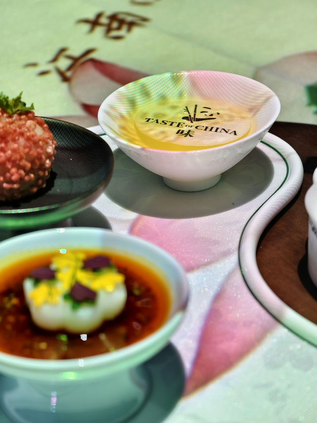 No exaggeration—this is the most extraordinary "dinner party" I’ve attended recently. No traditional round tables, no harsh overhead lights. Walking into this restaurant feels like stepping into a slowly unfolding dream of light, shadow, and Chinese culinary heritage. ✨ About the experience: This isn’t a regular restaurant—it’s more like an edible museum. Each dish represents a cultural slice of a different region, using ingredients to narrate landscapes and flavors to tell human stories. The technology doesn’t feel cold—it’s poetic. What flows across your table isn’t just projection; it’s the Yellow River, the rain of Li River, an inkstone you can “write” on, a pond where you can “catch” fish. The performances aren’t disruptive—they’re woven into the narrative. Face-changing evoked collective “wows,” and the water sleeve dance was so mesmerizing I forgot to eat. 👘 About the costumes: I highly recommend trying them! I’m not a Hanfu enthusiast, but the moment I put on a Song-style robe and finished the hairstyling, I truly understood what “ritual sensibility” means. There’s something profoundly moving about wearing Hanfu in the basement of a century-old government building while enjoying a tech-driven feast—a beautiful collision of eras. 🍵 About the food: You WILL get full! 8+ courses with tea—I almost couldn’t finish everything. Standouts: Beijing duck with hawthorn strips and jasmine tea (genius pairing against grease) Mapo tofu with Pixian bean paste + lobster (unexpected but brilliant fusion) Starry sky sweet rice balls (looks > everything, yet tastes even better) 📍Taste of China Immersive Dining · B1, The Old Municipal Hall, Bund 💵 Dinner: ¥888–¥1088 per person #shanghaifinedining #immersiveexperience #chinesebanquet #edibleart #techmeetstradition #culturalfeast #nextleveldining #shanghaifood #instashanghai #luxurydining