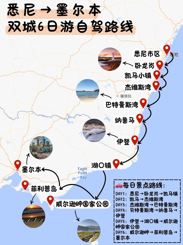 🌞 If there’s one road trip in Australia that’s absolutely worth driving, it has to be the East Coast route from Sydney to Melbourne! Crossing cliffside sea bridges, white sandy beaches, blue bays, and wildlife sanctuaries all along the way 🦘 🚗 If you haven’t checked off this self-drive route yet, save this now! We’ve got all the tips lined up for you! 🌅 Day 1|Sydney → Wollongong → Kiama Start your morning along the famous Sea Cliff Bridge, where the blue sky and ocean waves create a truly healing scene! 📸 Photo spots: Bald Hill Lookout, Wollongong Head Lighthouse, Kiama Blowhole 🌊 Don’t miss the sunset at Kiama Lighthouse, the coastal views are magical! 🍽 Recommended: Silica Restaurant 🌊 Day 2|Kiama → Jervis Bay 🕐 About 2 hours Today’s highlight is the “world’s whitest beach” — Hyams Beach 🌴 Experience the pure blues and whites, and hike up the Murray's Lighthouse trail. On a clear day, every shot looks postcard-perfect! 📸 Photo spots: Hyams Beach entrance sign, Murray’s Beach Lighthouse platform 🐬 You can also join a sea cruise to see whales and dolphins swimming alongside 🍽 Recommended: 5 Little Pigs 🌴 Day 3|Jervis Bay → Batemans Bay 🕐 About 3.5 hours Pass through the towns of Milton and Ulladulla, perfect for a break and some photos ☕ 📸 Photo spots: Clyde River Bridge at sunset, Koala selfies at Mogo Zoo 🍽 Recommended: Starfish Deli 🌅 Day 4|Batemans Bay → Narooma → Eden 🕐 About 3.5 hours Today’s coastal views are dreamlike! Narooma is famous for its turquoise bay. Be sure to visit Australia Rock (shaped like the map of Australia 🇦🇺) and Bar Rock Lookout! Arrive in Eden by evening to watch the sunset at Snug Cove harbor 🌇 🍽 Recommended: Drift Eden Café 🏞 Day 5|Eden → Lakes Entrance → Wilsons Promontory 🕐 About 5.5 hours Wilsons Promontory National Park is the southernmost point of Victoria, where you’re likely to encounter various Australian wildlife. Explore Squeaky Beach or hike to the summit of Mount Oberon for a breathtaking coastal sunset 🌄 🍽 Recommended: Tidal River Café 🐧 Day 6|Wilsons Promontory → Phillip Island → Melbourne 🕐 About 4.5 hours Meet the adorable penguins on Phillip Island 🐧 In summer, you can pick strawberries at the strawberry farm and enjoy ice cream 🍓 📸 Photo spots: Nobbies Boardwalk, Flinders Street Station night view 🍽 Recommended: The Cape Kitchen 💡 Self-Drive Tips ✅ This route is best for spring and summer travel, with beautiful scenery and good weather ✅ Fuel up in the small towns along the way; since the distances are long, it’s best to fill up whenever you see a gas station ✅ Bring sunscreen, swimwear, and light hiking shoes—there are plenty of beaches and hiking trails along the route